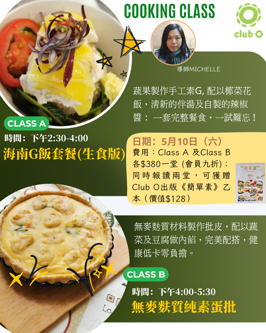 Club O 旺角亞皆老街86號昌明大厦7字樓FGH室Cooking Class A:海南G飯套餐 ( 生食版 ) 日期:5月10日(星期六) 時間:2:30 - 4:00 地點:九龍旺角亞皆老街86號昌明大廈7樓F室 收費:每班$380(會員9折) *報讀兩班參加者,送《簡單素》(價值$128) 導師:Michelle ▌Google Form 報名:https://forms.gle/DAqVdHmH5cyWtNz1A ▌報名、查詢詳情 2619 0000 │ WhatsApp 6773