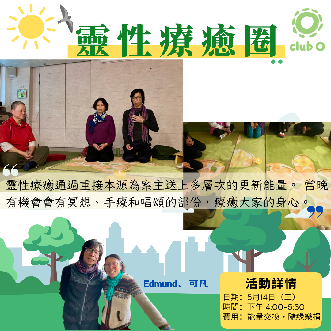 Club O 旺角亞皆老街86號昌明大厦7字樓FGH室靈性療癒圈 日期:5月14日(星期三 ) 時間:4:00-5:30pm 地點:九龍旺角亞皆老街86號昌明大廈7樓F室 收費:隨心定價 導師:周可凡 / Edmund Fung ▌Google Form 報名:https://forms.gle/fMbuYQSbgTeypknn9 ▌報名、查詢詳情 2619 0000 │ WhatsApp 6773 6361 https://wa.me/85267736361