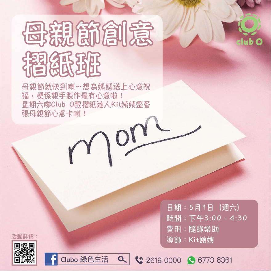 Club O 旺角亞皆老街86號昌明大厦7字樓FGH室母親節就快到喇~想為媽媽送上心意祝福,梗係親手製作最有心意啦! 星期六嚟Club O跟摺紙達人Kit姨姨整番張母親節心意卡喇! 導師:Kit 姨姨 日期:2021年5月1日(週六) 時間:下午3:00-4:30 費用:隨緣樂捐,鼓勵捐助支持本會工作 ------------------------------------------------------------------- 報名表:https://forms.gle/GqYruiWx7XZYDqD19 ------------------------------------------------------------------- 馬上申請成為Club O會員, 享有會員優惠: https://forms.gle/p5tfx2Cjir9Uy5EU8 * * * * * * * * *